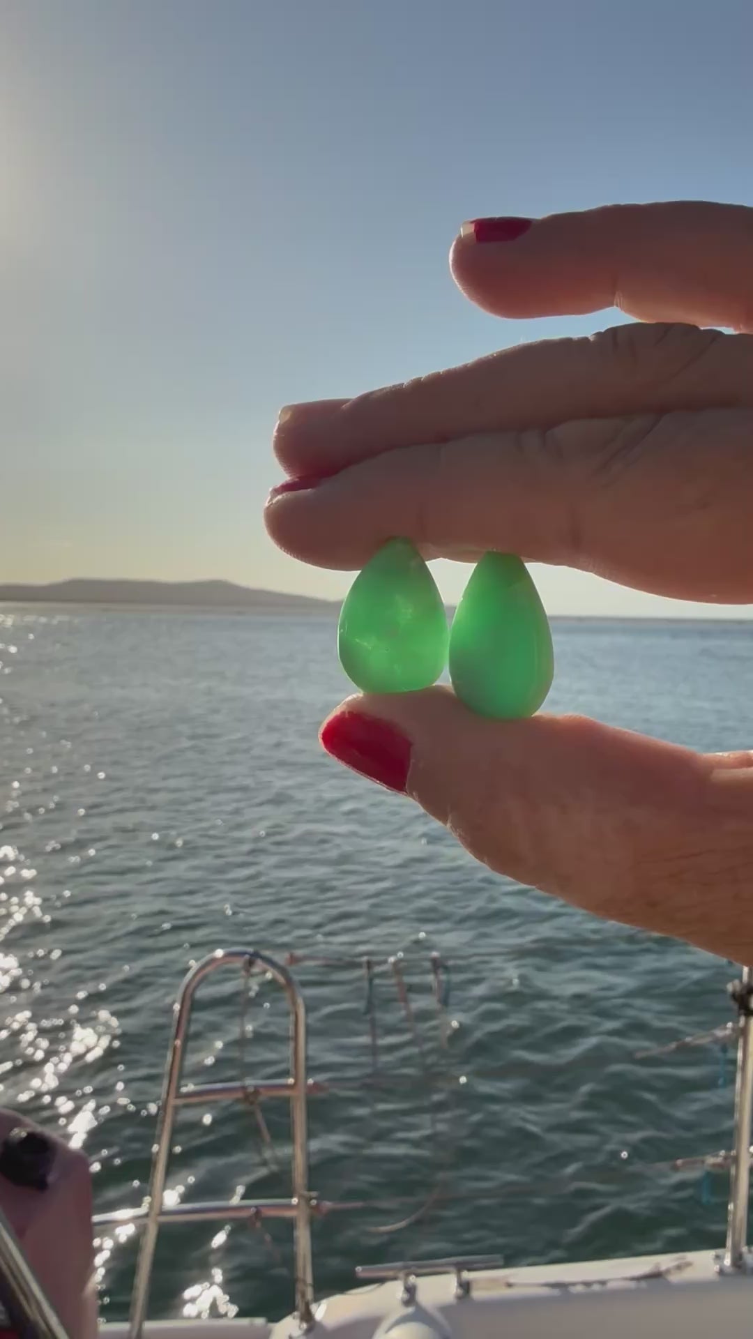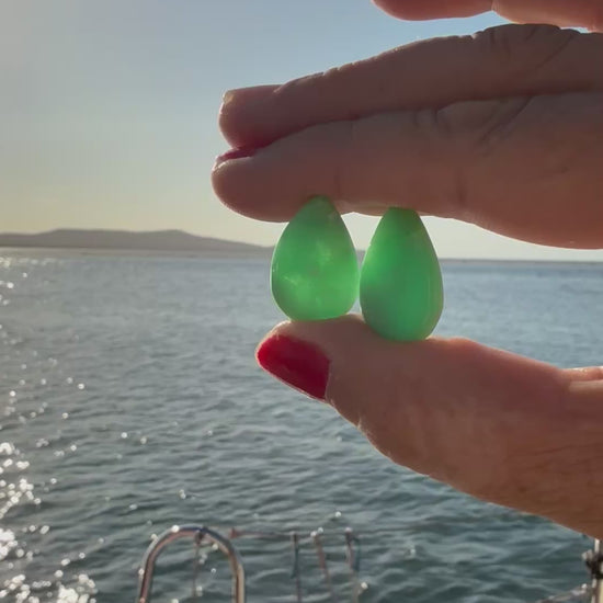 Thank you for loving my hand-cut Chrysoprase earrings. These stones are from Western Australia and hand-cut by me in this beautiful teardrop shape. Hugged in Sterling Silver they truly glow an apple-green hue in the sunshine. Perfect for everyday wear or add some pop of colour to your evening.
