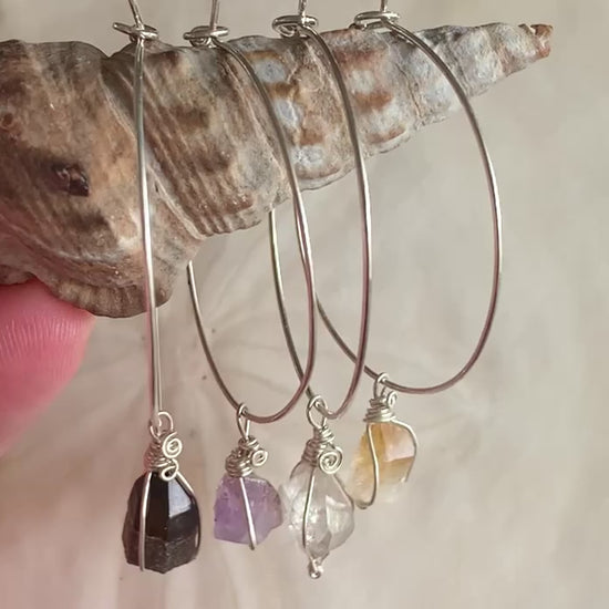 Thank you for loving my hand-cut Gemstone crystal points. These beauties are from a genuine cluster geode, matched as close as possible to the perfect pair and hugged in Sterling Silver wire. They hang beautifully from hand forged hardened Sterling Silver hoops with an angled loop to ensure they stay sung behind your ears.